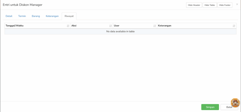Kolom-kolom pada Diskon Manager Riwayat: